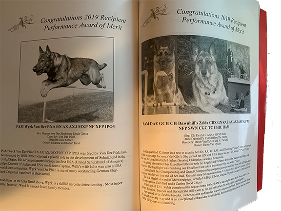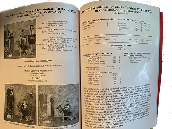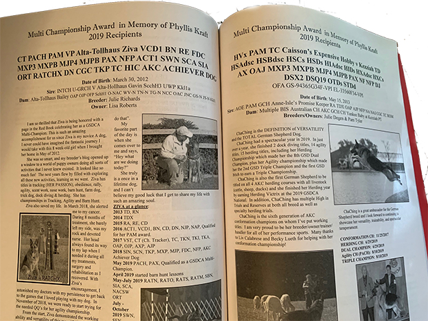 But the Red Book is not just for and about breeders. There’s a robust performance section, where we show GSDs with Championships in multiple venues; Performance Champions, a page with photo for earners of the Performance Award of Merit (PAM), the National performance winners and Versatility competitors, the ATAA – Annual Training Achievement Awards – Dual Titled GSDs and rankings of the year’s Obedience and Rally competitors.