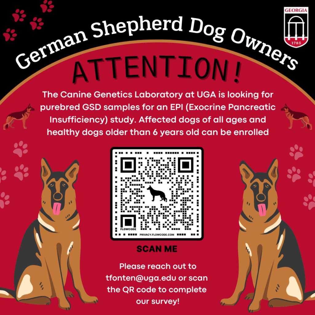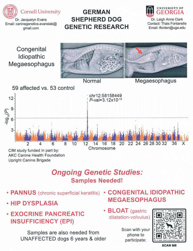 Prior to the Annual Meeting on Thursday at the 2023 National there was a presentation on GSD Genetic Research being done at Cornell and University of Georgia, studying Megaesophagus, Pannus, EPI and other health issues. DNA Samples are Needed, both from affected dogs of any age as well as healthy dogs aged 6 or older! The flyer is below, SCAN the code with your phone to participate!