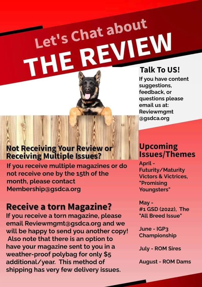 The German Shepherd Dog Review is the official publication of the German Shepherd Dog Club of America. Devoted to the interest of the German Shepherd Dog, owners, breeders, and fanciers. It’s a benefit of membership in the GSDCA, offered 6 times a year in print and also online here in the Membership area. Send ideas, questions or comments to: reviewmgmt@gsdca.org