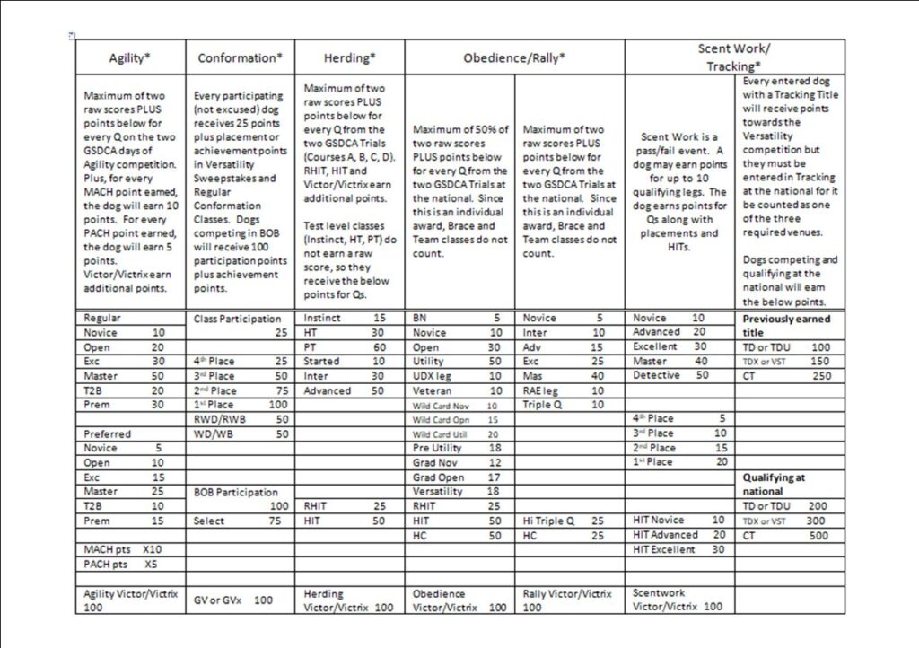 Obedience/Rally: Obedience and Rally are combined as one venue since the skills are very similar. However, dogs may earn 2 raw scores in BOTH events. Any two qualifying runs that receive a score from the GSDCA trials, will count as weighted scores towards the total. Obedience Versatility Scores will be computed as 50% of the RAW SCORE plus points. Rally Versatility Scores will be computed as RAW SCORE plus points. Although only two qualifying runs from EACH event (Obedience and Rally) receive a weighted score, all other qualifying runswill receive points.